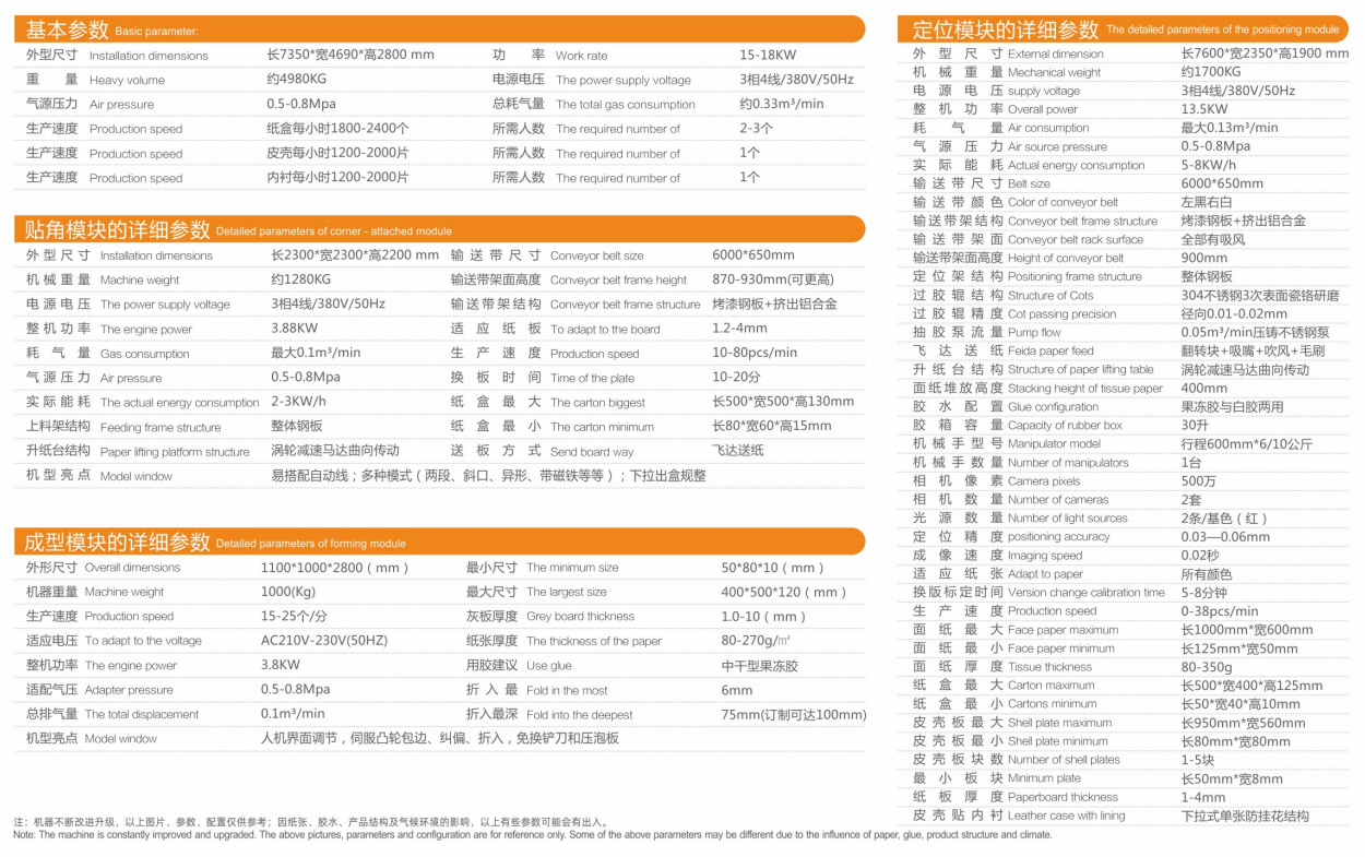 該機(jī)主要分為定位模塊、貼角模塊和成型模塊三大部分,可實現(xiàn)各類紙盒、木盒、膠盒生產(chǎn)時的自動送紙、自動過膠、自動貼角、自動定位、自動成型和自動壓泡等,系列工藝工序的自動完成,轉(zhuǎn)版速度快,制作盒體精美。定位模塊的黑白皮帶、雙鏡頭、自動糾偏、皮殼板貼襯定位、五片板定位。貼角模塊的不粘膠膠帶槽、雙升紙臺。成型模塊的智能調(diào)節(jié)、自動鎖固、伺服凸輪動作、免換鏟刀和壓泡板等,均由我司自行研發(fā)設(shè)計生產(chǎn),并獲得多項國家專利。